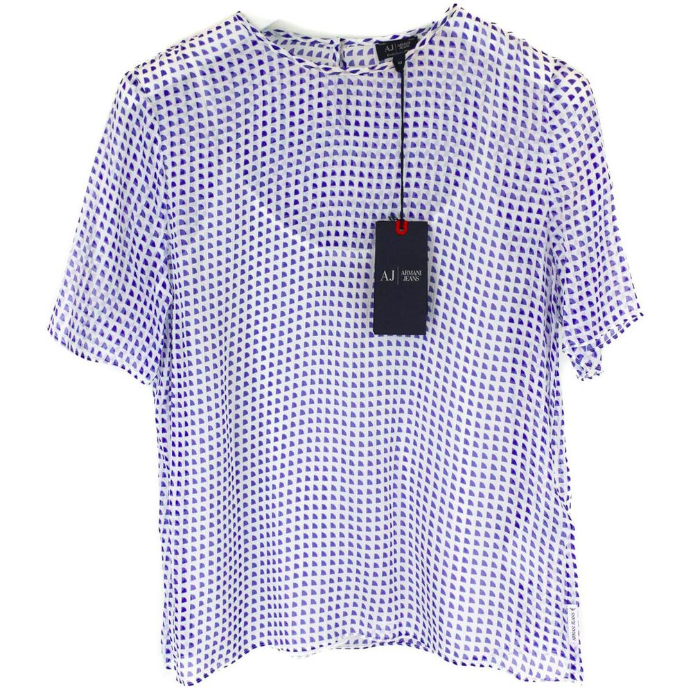 Armani Jeans women's silk blouse with transparent finish, removable lining, white and blue geometric pattern print, crew neck.